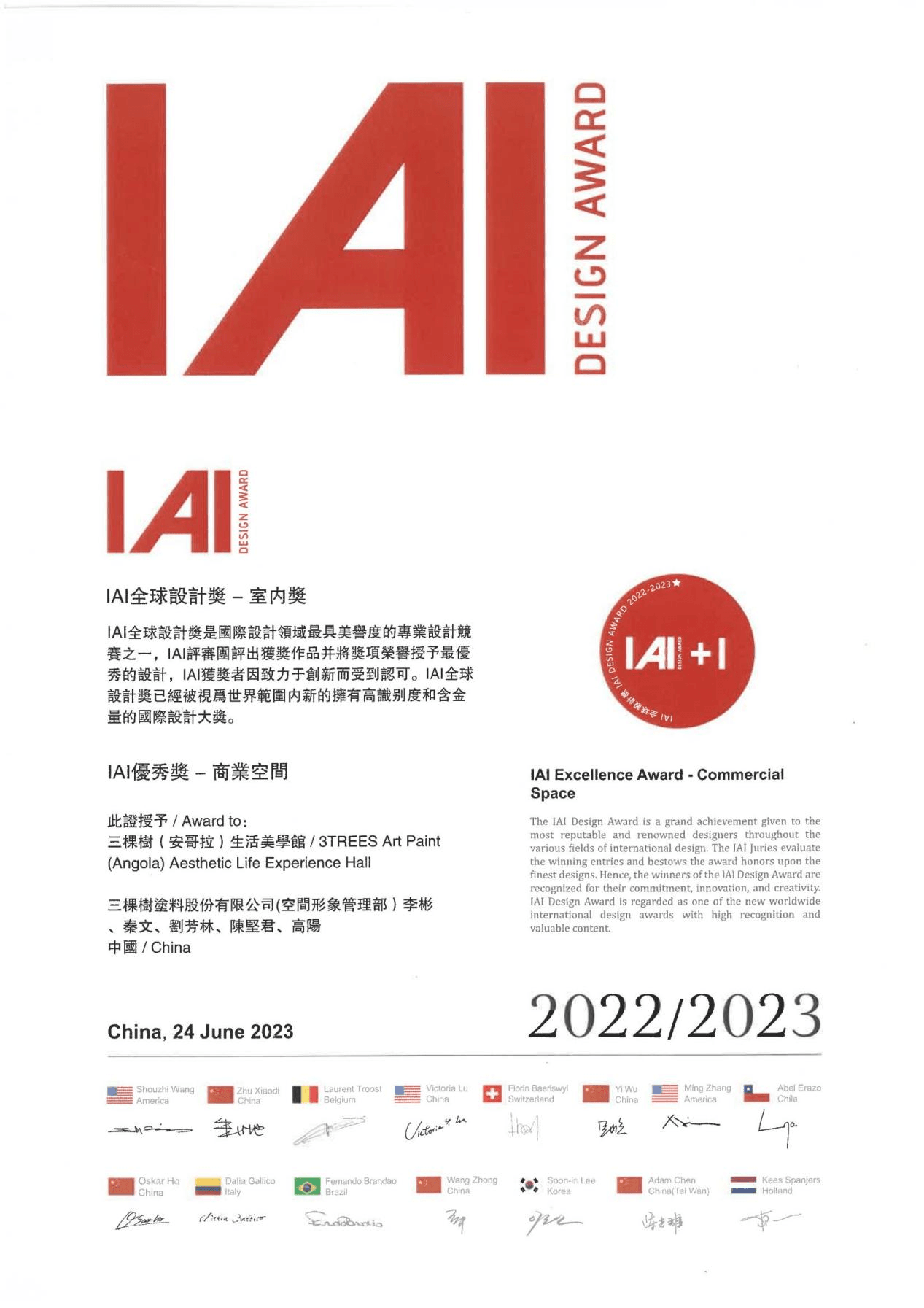 近日,极具国际影响力和美誉度的设计竞赛IAI Design Award(简称IAI)揭晓了2022/2023年获奖名单,三棵树空间形象管理部设计的参赛作品——三棵树(安哥拉)生活美学馆,凭借国漆国色的东方美学意境和源于大自然的艺术灵感,荣获室内类(IAI+I)优秀奖。