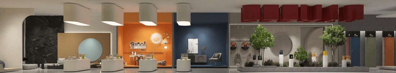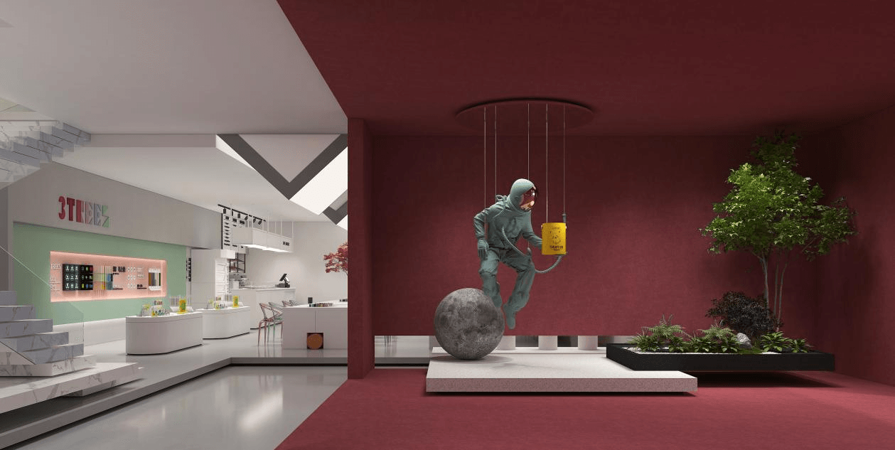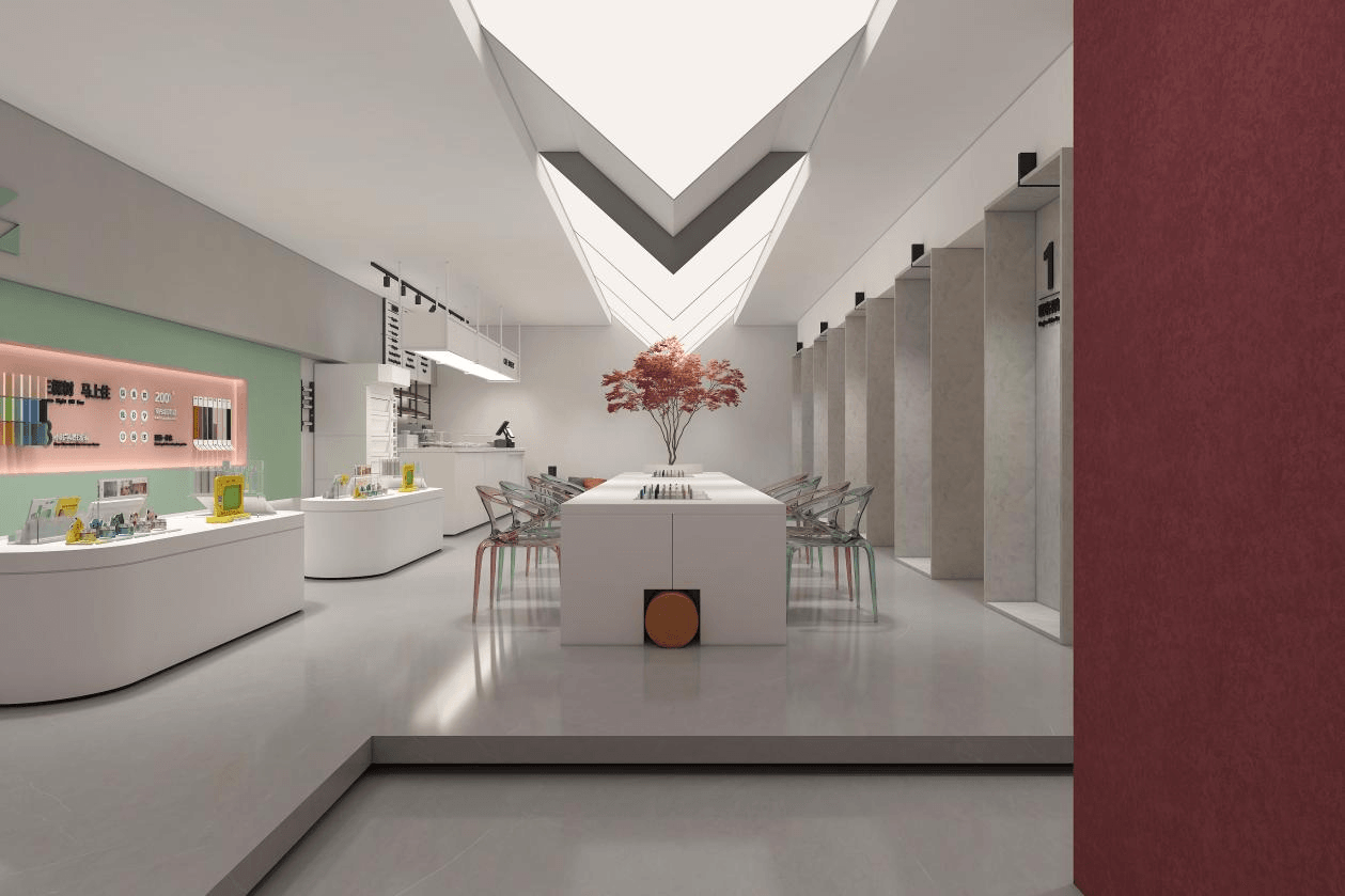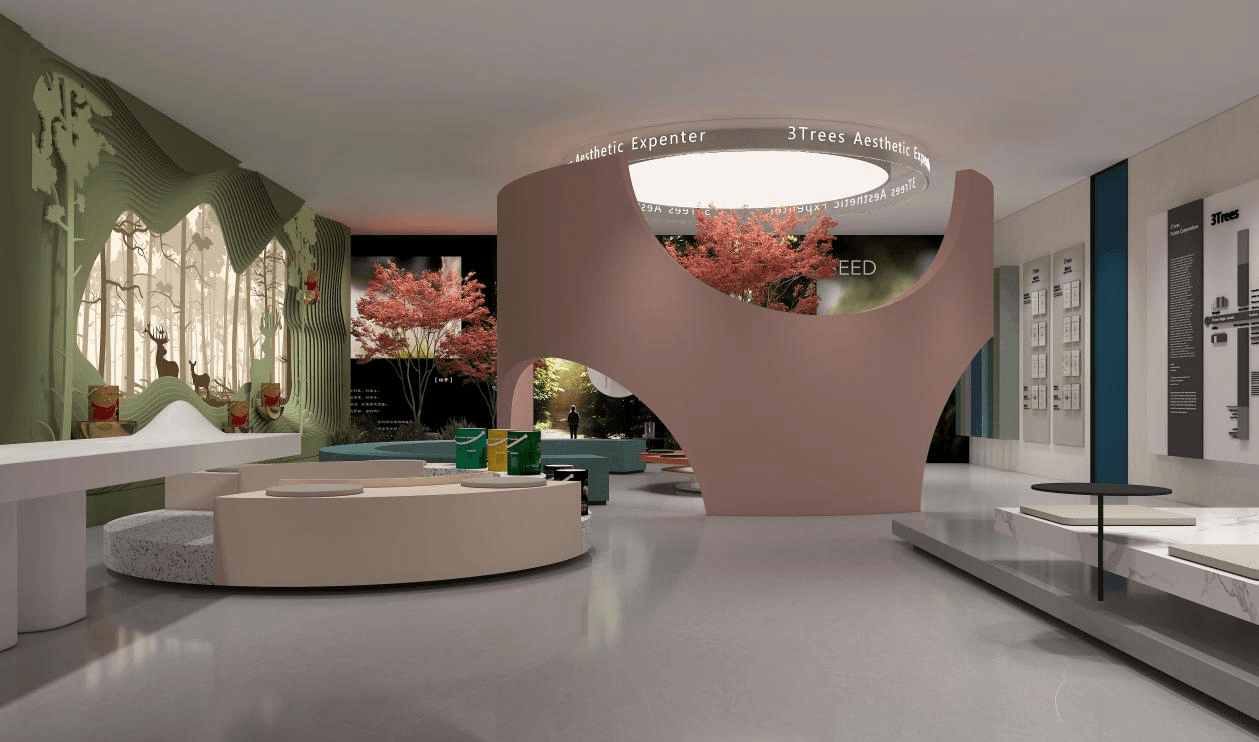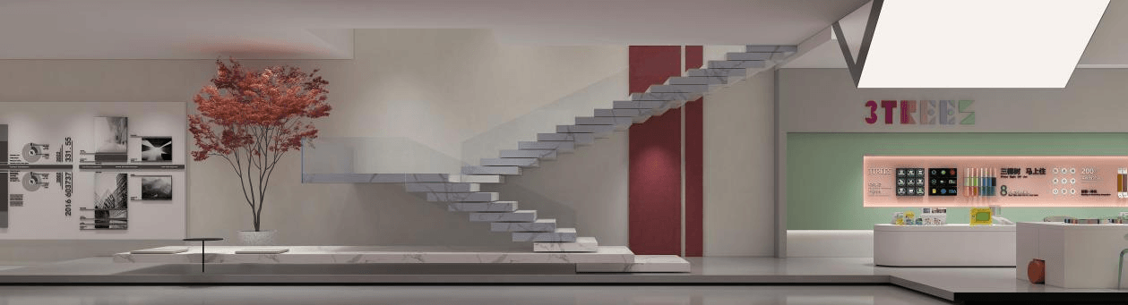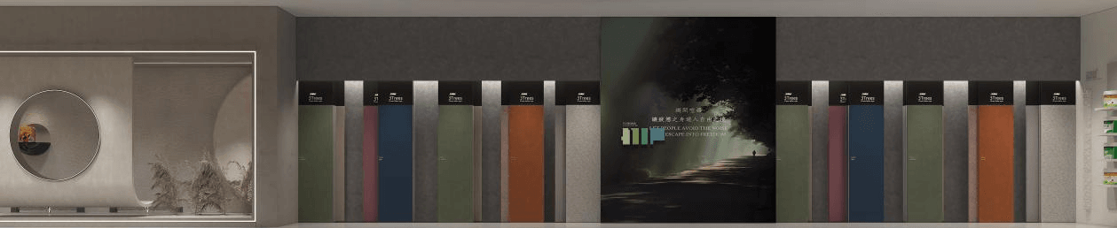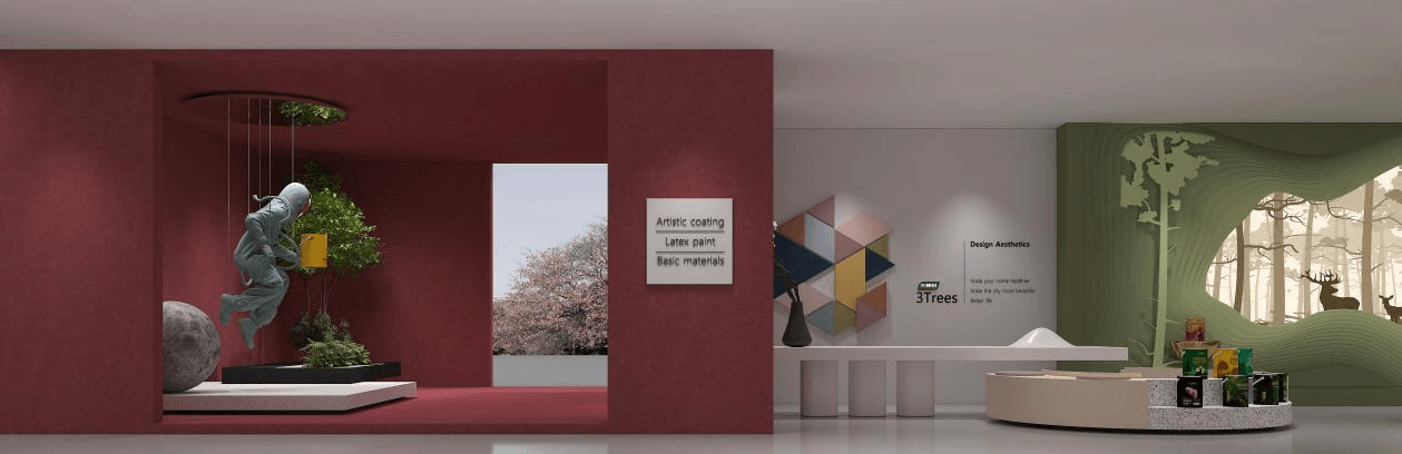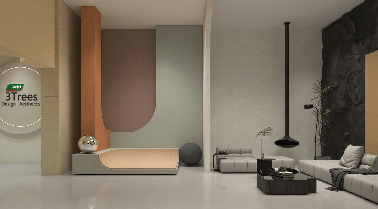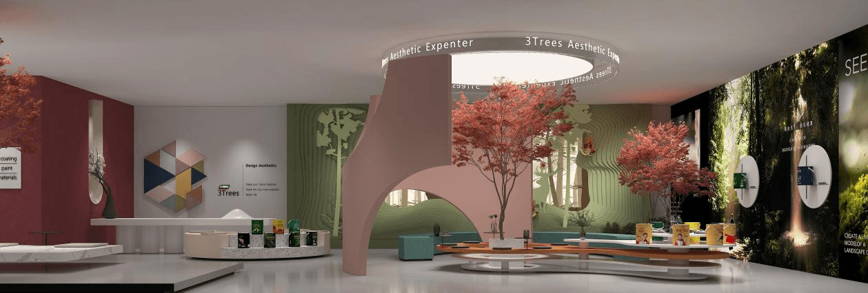 此次展厅以“国漆国色-爱上中国色”为主题,充分发挥三棵树艺术漆4.0店态优势,将“道法自然”的生态观融入其中,大量运用光影、结构呈现东方美学意境,表现出艺术漆特有的颜色、肌理质感与审美层次,让中国美色绽放于世界。