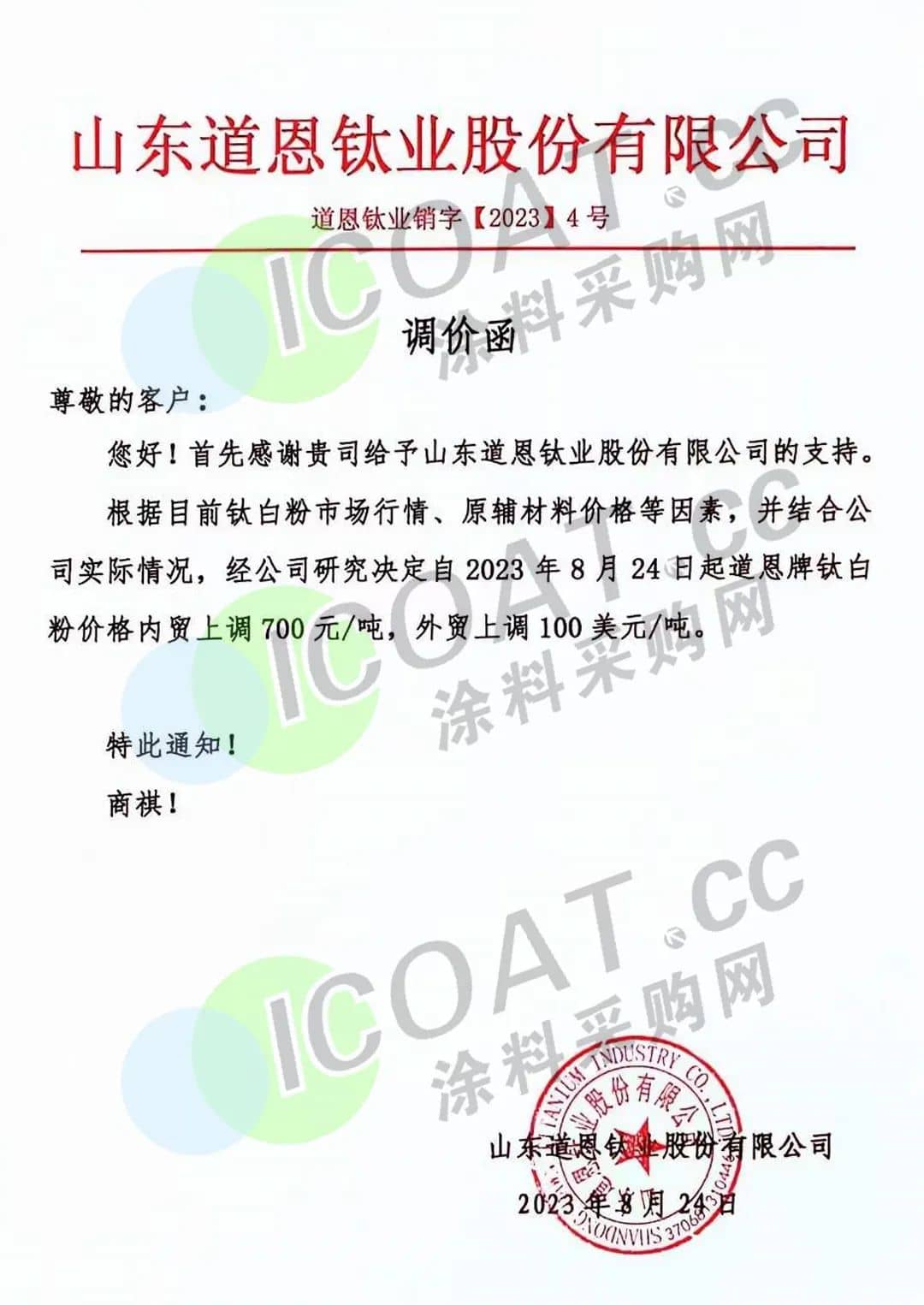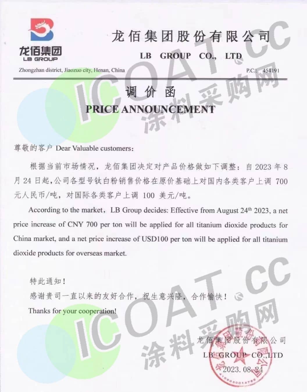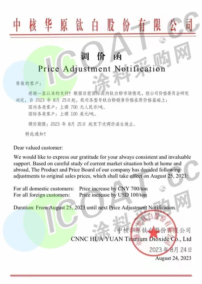 昨日(24日),龙佰集团发布调价函,称8月24日起,各型号钛白粉销售价格在原价基础上,对国内各类客户上调700元/吨,对国际各类客户上调100美元/吨。