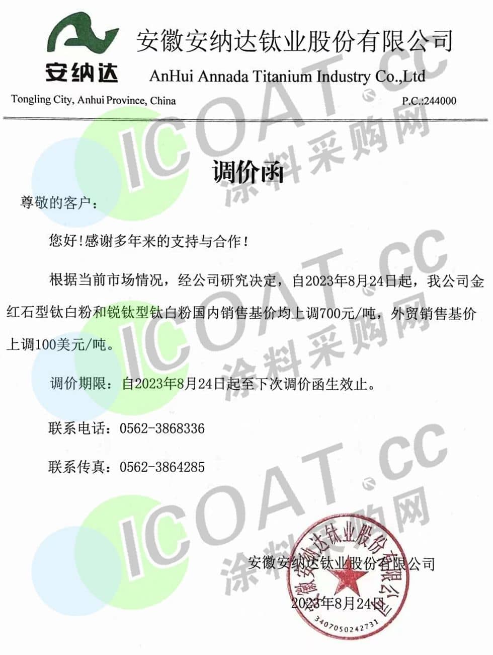 安纳达表示,8月24日起,金红石型钛白粉和锐钛型钛白粉国内销售基价均上调700元/吨,外贸销售基价上调100美元/吨。