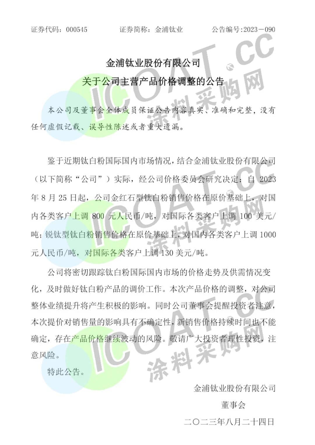 金浦钛业表示,自8月25日起,金红石型钛白粉销售价格在原价基础上,对国内各类客户上调800元/吨,对国际各类客户上调100美元/吨;锐钛型钛白粉销售价格在原价基础上,对国内各类客户上调1000元/吨,对国际各类客户上调130美元/吨。