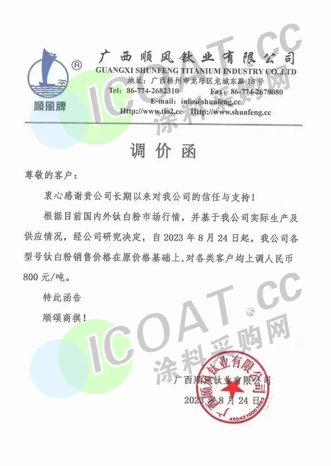 广西顺风钛业表示,24日起,公司各型号钛白粉销售价格,各类用户均上调800元/吨。