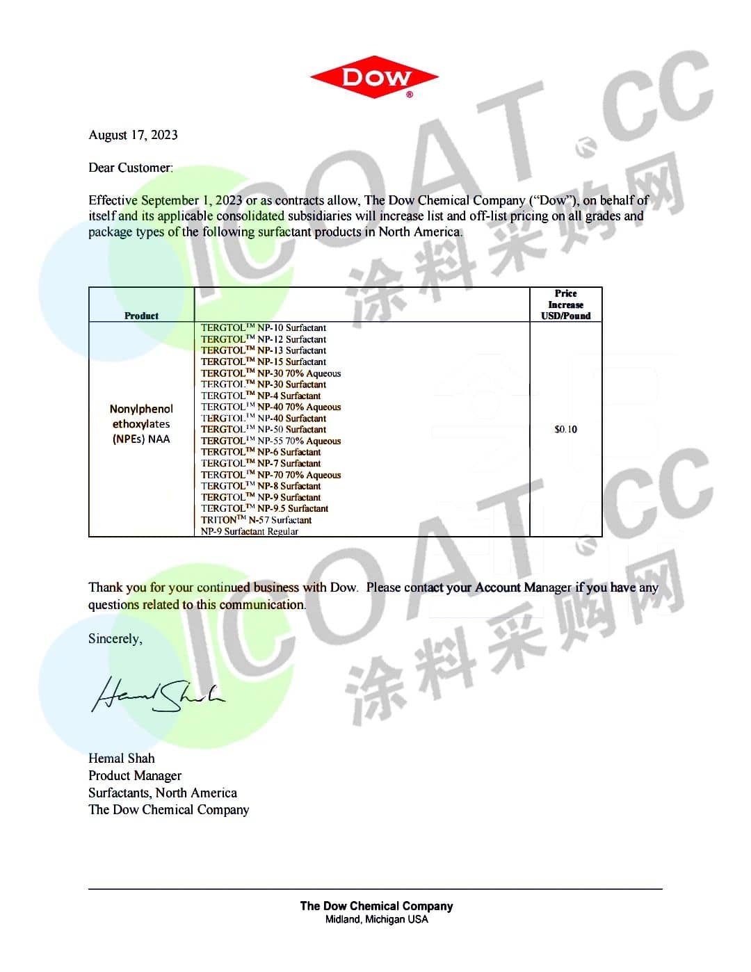 陶氏化学发布涨价函称,自9月1日起上调北美地区所有等级和包装类型的表面活性剂价格,最高上涨为0.1美元/磅(约合人民币1612元/吨)。而在此前,陶氏有机硅曾宣布,对陶氏化学有机硅高能建筑业务主要产品实施价格提升,调整的涨幅为5-10%。
