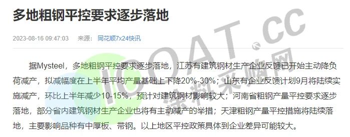 近日,多地粗钢平控要求逐步落地。江苏有建筑钢材生产企业反馈已开始主动降负荷减产,拟减幅度在上半年平均产量基础上下降20%-30%;山东有企业反馈计划9月将陆续实施减产,环比上半年减少10-15%,河南部分省内建筑钢材生产企业也将有主动减产的举措;天津粗钢产量平控措施将陆续落地,主要影响品种有中厚板、带钢。