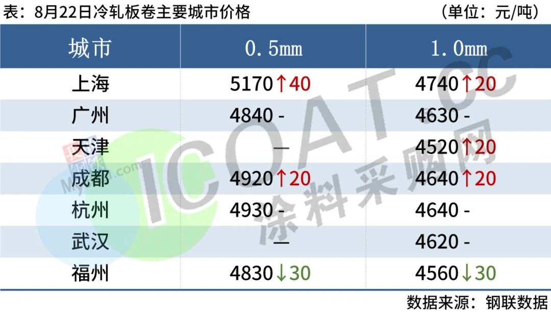 冷轧板卷市场,全国24个主要城市1.0mm冷卷均价4643元/吨,较上个交易日上涨1元/吨。