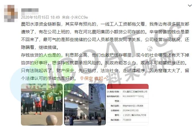 晨阳水漆的纠纷远不止是关联的卓融基金,还包括供应商的货款和前员工的工资。自2020年开始,就曾出现多人聚集在晨阳水漆科技园北门和徐水县有关部门门口进行“讨债”的情况,而后陆续有网友在社交平台诉苦,但仍未推动事情向有利的方向发展。