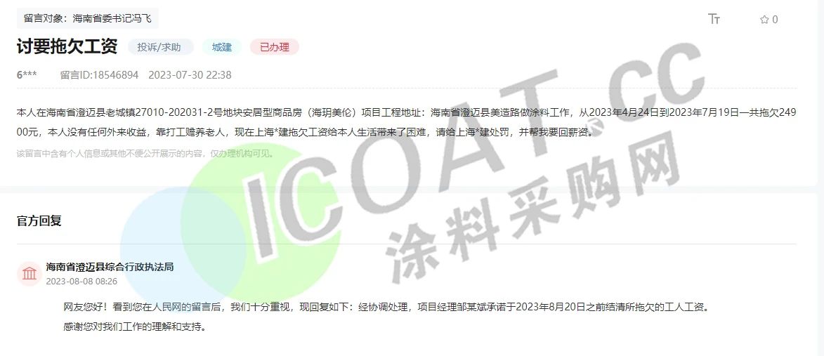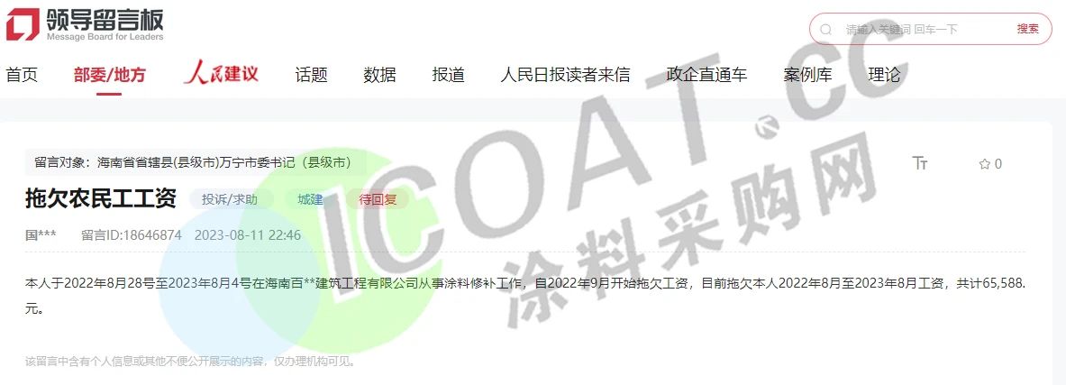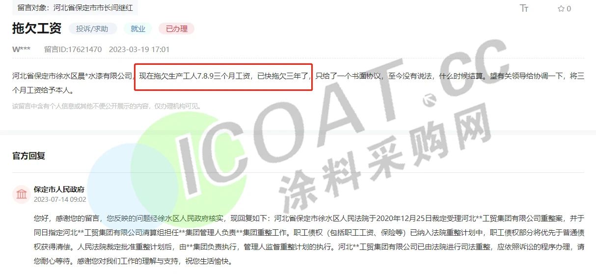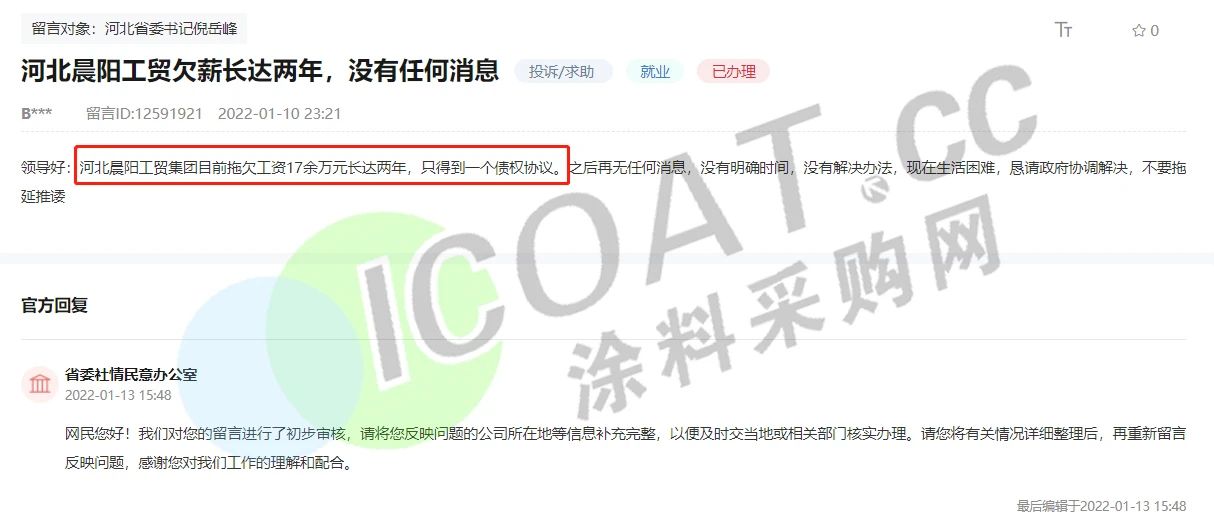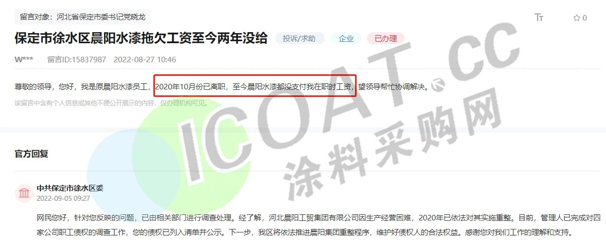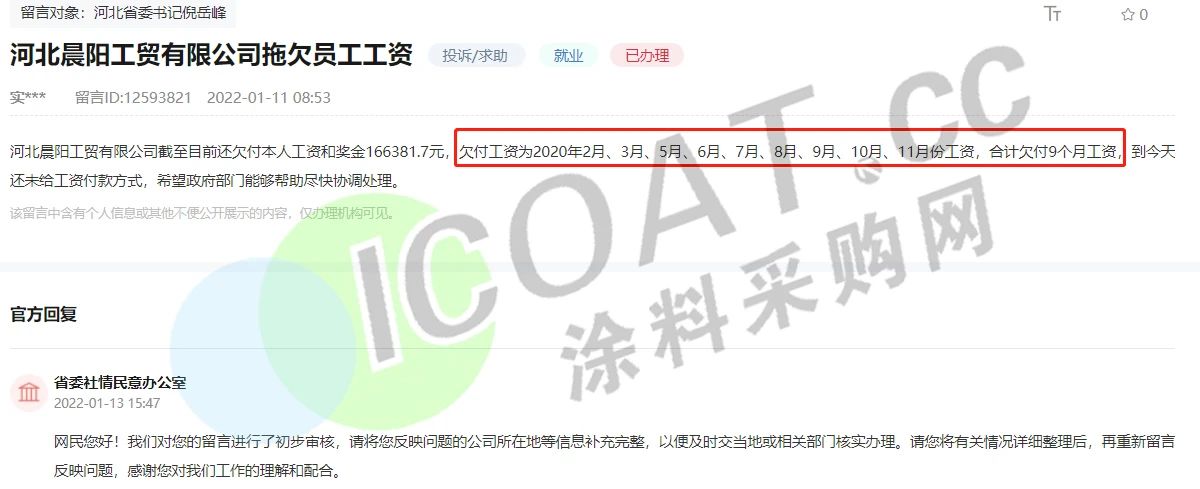在人民网领导留言板平台,不少网友自述是原晨阳水漆员工,“控诉”离职后已经过了几年,企业却仍未支付其在职时的工资。回应中的“依照诉讼的程序办理,请您耐心等待”却没能让这些被拖欠了工资的人得到一丝心安。
