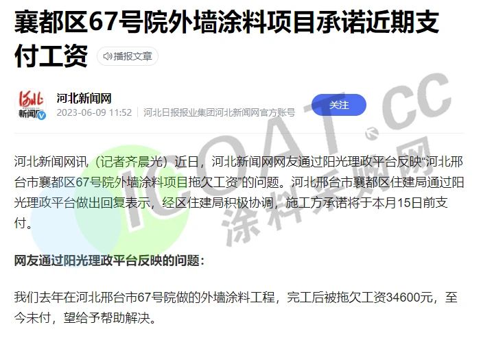 河北网友反映“河北邢台市襄都区67号院外墙涂料项目拖欠工资”。