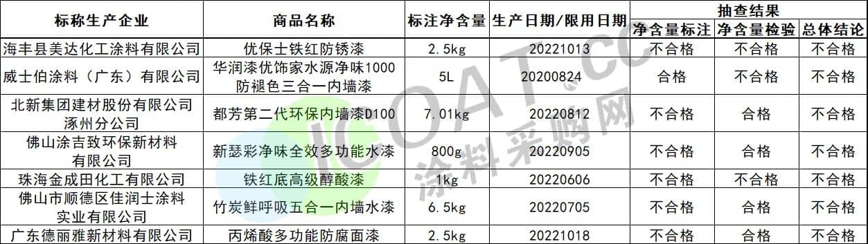 除此之外,知名涂料企业威士伯涂料、北新建材等因净含量标注或净含量检验不合格,最终被标记为“不合格”。