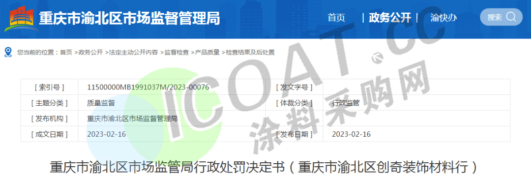 重庆市市场监督管理局“重庆市渝北区创奇装饰材料行”销售的防水涂料进行质量监督抽查。经抽样检验,断裂伸长率(无处理)、断裂伸长率(加热处理)不符合GB/T 23445-2009标准,没收不合格的防水涂料2桶,没收违法所得260.00元,罚款540.00元。