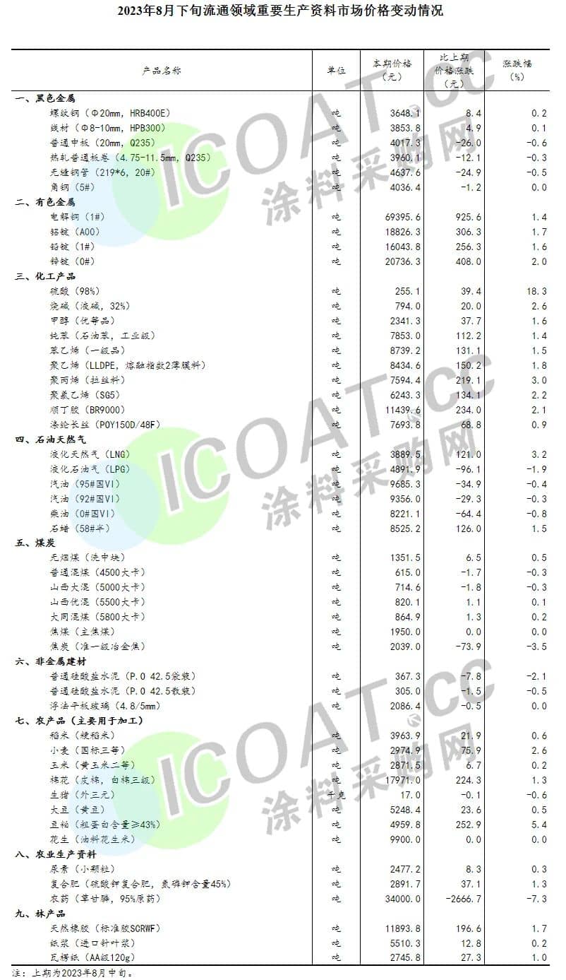 在国际原油价格持续上涨的刺激之下,很多大宗商品价格都出现了大比例增长。2023年8月下旬与8月中旬相比,全国流通领域9大类50种重要生产资料中,32种产品价格上涨,占比高达64%。