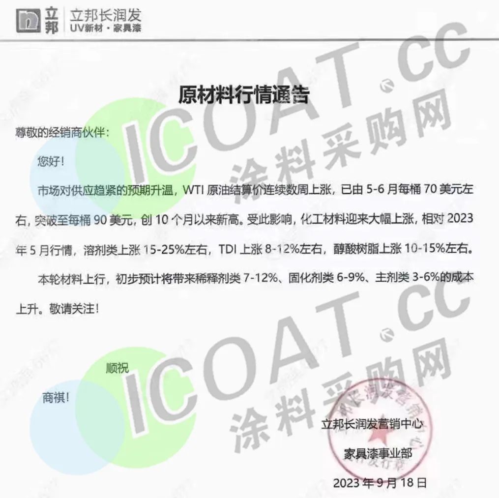 近日,立邦长润发营销中心家具漆事业部发布了一则《原材料行情通告》,称市场对供应趋紧的预期升温,WTI原油结算价连续数周上涨,已由5-6月每桶70美元左右,突破至每桶90美元,创10个月以来新高。受此影响,化工材料迎来大幅上涨,相对2023年5月行情,溶剂类上涨15-25%左右,TDI上涨8-12%左右,醇酸树脂上涨10-15%左右。本轮材料上行,初步预计将带来稀释剂类7-12%、固化剂类6-9%、主剂类3-6%的成本上升。