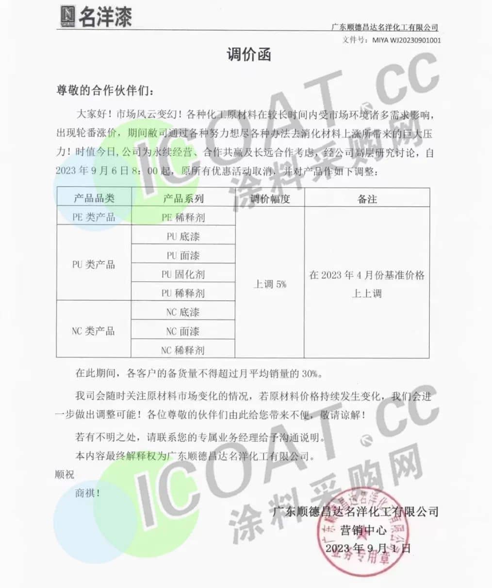 名洋漆发布调价函称,各种化工原材料在较长时间内受市场环境诸多需求影响,出现轮番涨价,期间敝司通过各种努力想尽各种办法去消化材料上涨所带来的巨大压力!经高层研究讨论,自9月6日8:00起,原所有优惠活动取消,并对PE类产品、PU类产品、NC类产品在2023年4月份基准价格上上调5%。并明确,各客户的备货量不得超过月平均销量的30%,不排除后续进一步调价的可能。