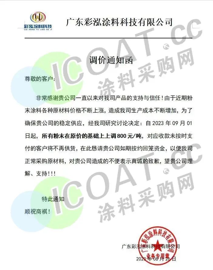 在此之前,光亚睿悦新材料表示,各型号伟德客户端官网销售价格在原价格基础上对各类客户上调800元/吨。广东彩泓涂料表示,所有粉末在原价的基础上上调800元/吨,且对应收款未按时支付的客户将不再供货。