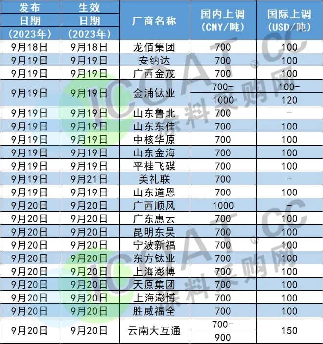 龙佰钛业、安纳达、道恩钛业、东方钛业、金茂钛业、惠云钛业、金海钛业、平桂飞碟等20多家钛白粉企业掀起年内第6轮涨价潮,钛白粉厂家生产成本居高不下,国庆节前夕部分企业限产、运输不畅,刺激了下游厂家集中补充库存。另外由于9、10月终端季节消费尚可,多数厂家前期预收订单充足,赶单交货状态持续,涨价意愿较为强烈。
