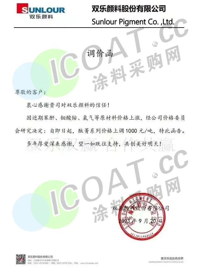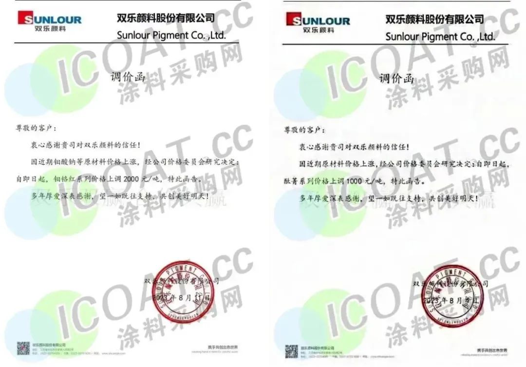 颜料行业,双乐颜料在近2个月内连发3封涨价函,钼铬红产品价格上调2000元/吨,酞菁系列产品价格2次累计上调2000元/吨。
