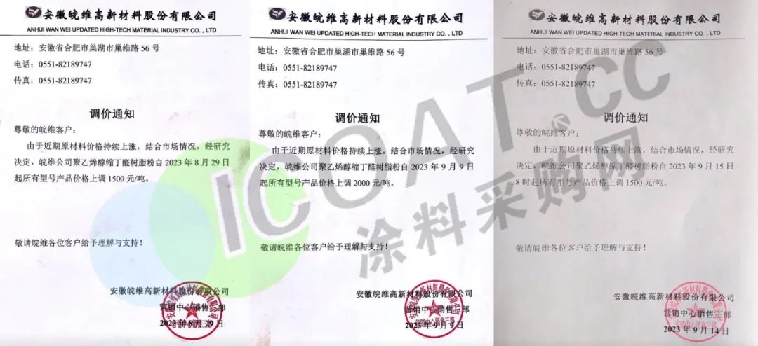 安徽皖维高新材料连发3份涨价函表示,聚乙烯醇缩丁醛树脂粉8月29日上涨1500元/吨,9月9日起上涨2000元/吨,9月15日8时起上涨1500元/吨。