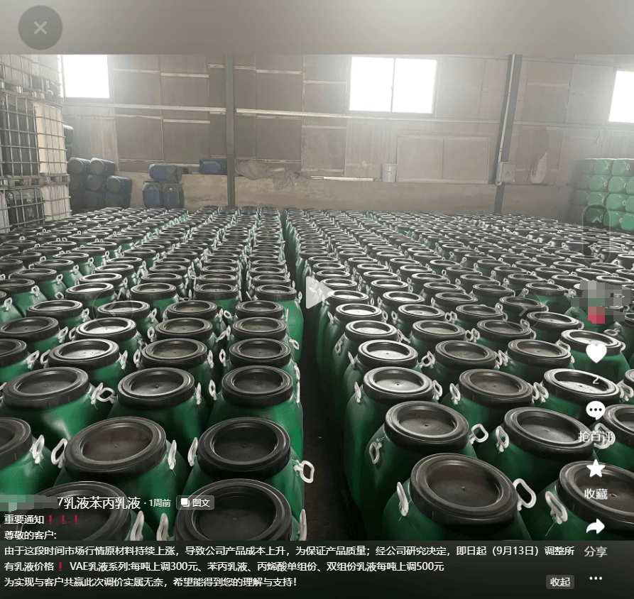 某苯丙乳液企业通知,9月13日调整所有乳液价格,VAE乳液上调300元/吨,苯丙乳液、丙烯酸单组份、双组份乳液上调500元/吨。