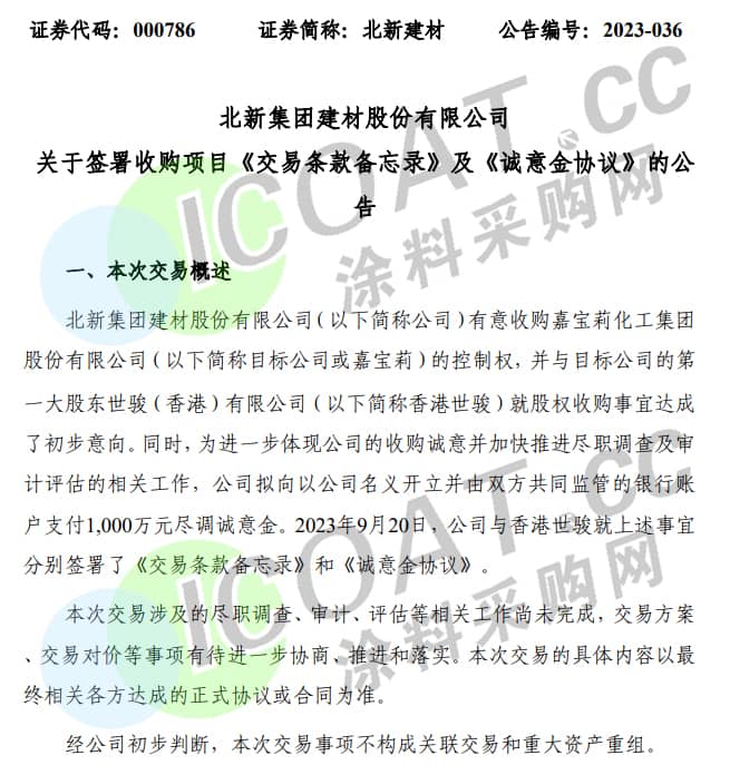近日,北新建材宣布,有意收购嘉宝莉的控制权,并与目标公司的第一大股东香港世骏签署了《交易条款备忘录》和《诚意金协议》。对于此次收购,北新建材拿出了1000万元意向金。