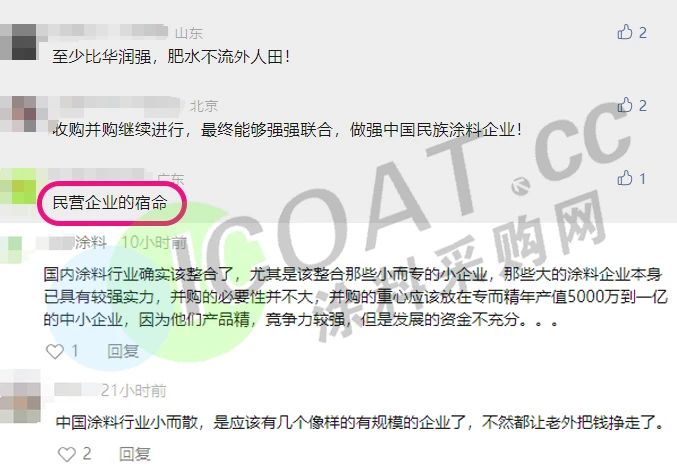 但即便是如此优秀,仍旧免不了被收购的命运。对此,网友们给出了不同的看法,有人说,国内涂料行业确实该整合了,散乱污的企业被取缔的同时,小而专的企业也应该有所发展,也有人说,应该有几个“像样”的企业挺起来,以免行业中的市场份额被外资企业垄断,钱都让别人挣走了。但值得关注的是,多数人表示,这是民营企业的宿命。
