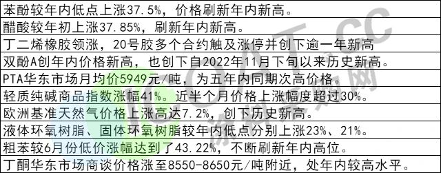 能化品涨了,自6月1日以来,能源、有机化工、橡胶价格指数分别上涨16.41%、17.88%和14.99%。20多家钛白粉企业连涨6轮,颜料、填料、树脂、乳液等近百种产品创内年新高。