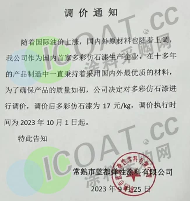 常熟市蓝都弹性涂料:决定对多彩仿石漆进行调价,调价后多彩仿石漆为17 元/kg,调价执行时间为2023年10月1日起。