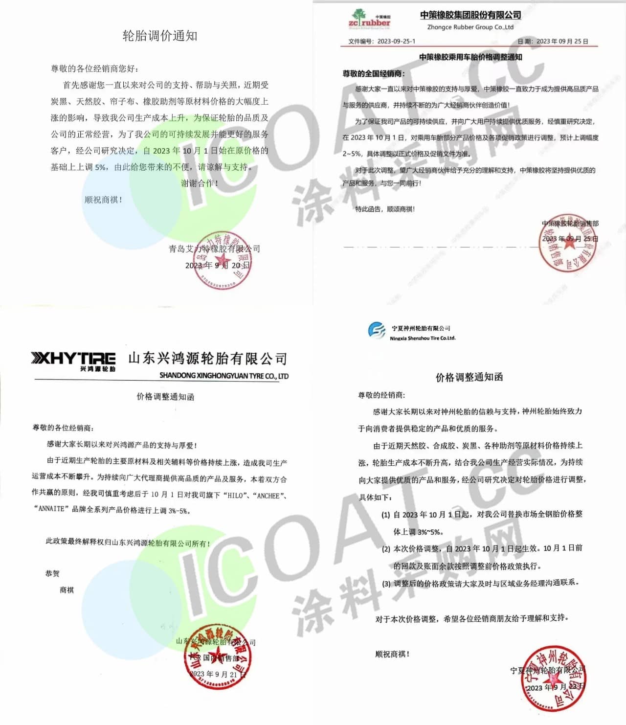 潍坊市华东橡胶:10月1日起,针对华东橡胶国内替换市场的TBR所有品牌全系产品进行价格上调3%。