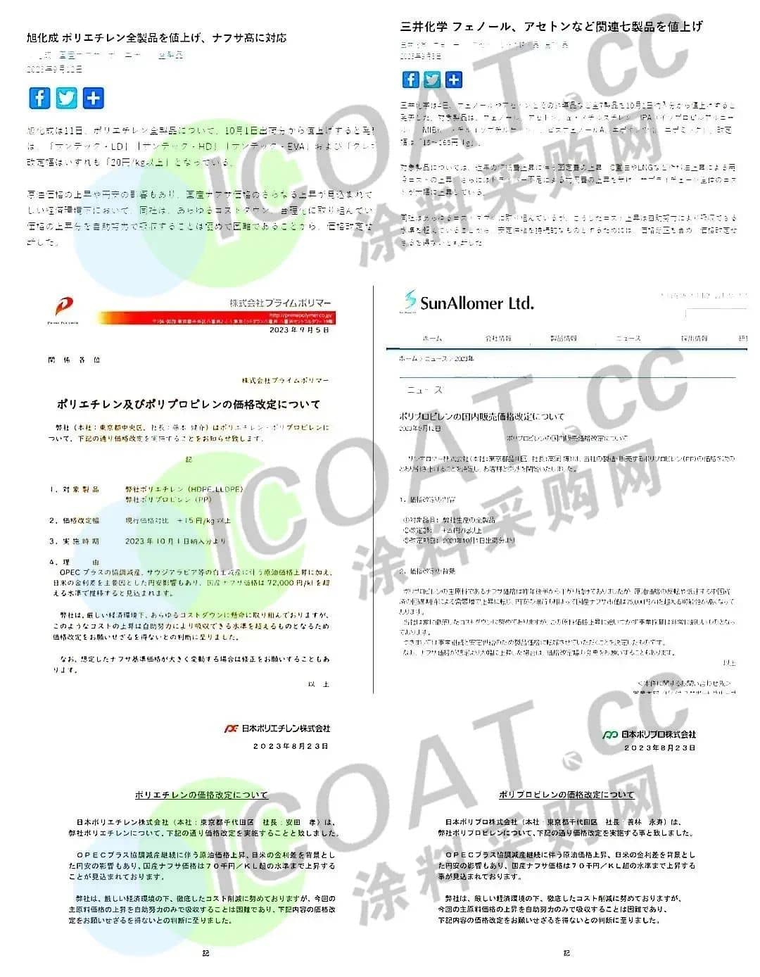 SunAllomerLtd.株式会社:自10月起上调公司所有PP产品的价格20日元/kg以上。