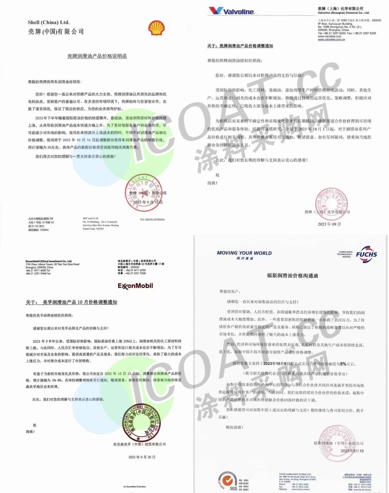 司能润滑油:自10月起,部分产品价格上调5%-10%不等。