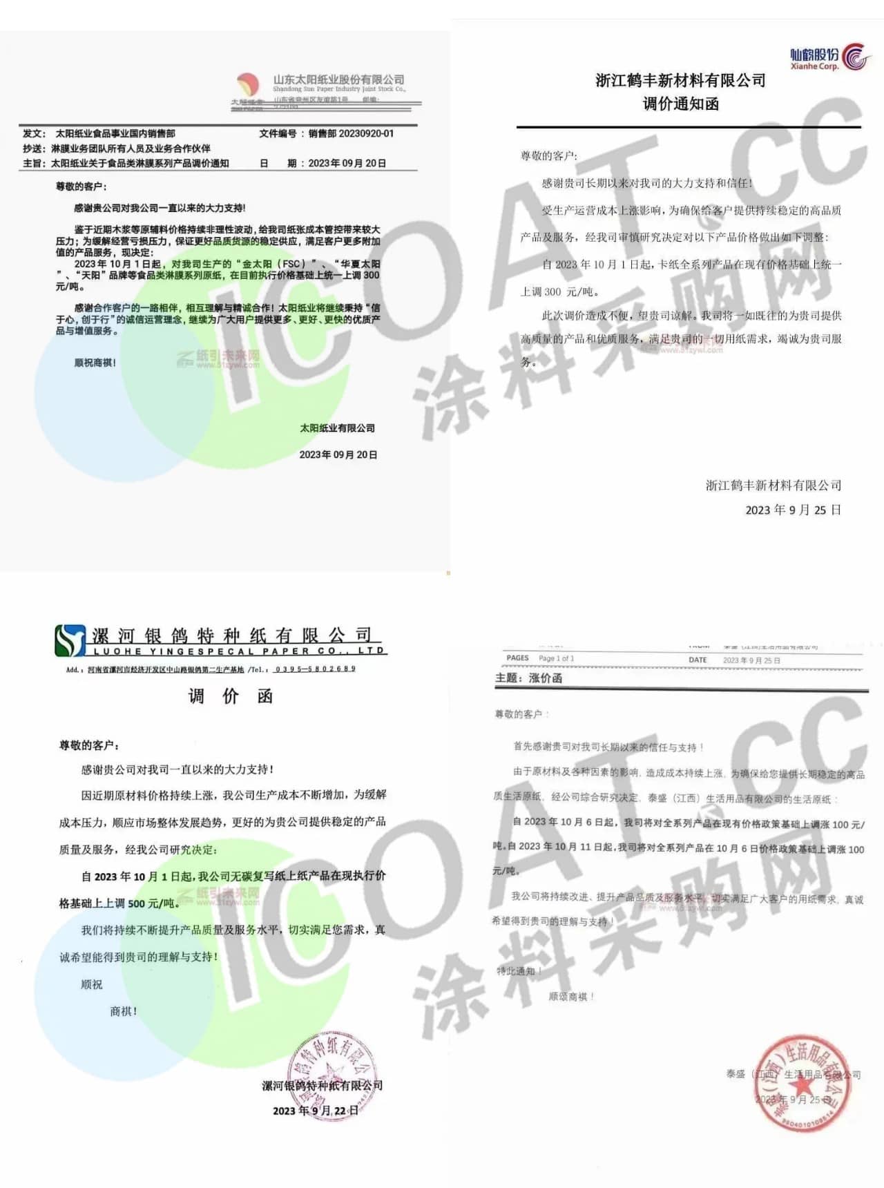 山东太阳纸业:10月1日起,对“金太阳(FSC)”“华夏太阳“天阳”品牌等食品类淋膜系列原纸,在目前执行价格基础上统一上调300元/吨。