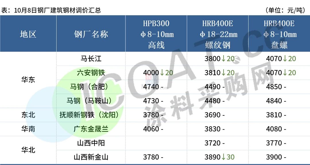 10月8日,全国累计7家钢厂发布调价信息,其中3家钢厂降价,整体调幅在0-30元/吨。