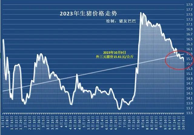 10月9日,国内生猪均价仅有15.61元/公斤,较前一日下降0.12元,比9月初下降了8.7%,相比双节期间15.9元/公斤的价格回落了0.31元/公斤。