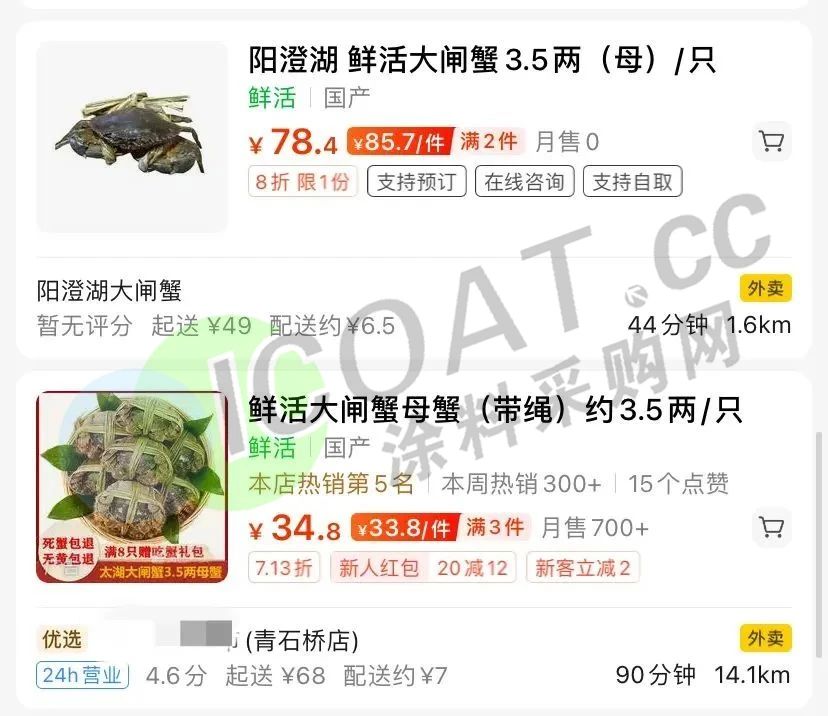 某线上平台一只125克(2.5两)的鲜活阳澄湖母蟹售价为39.9元,4只售价还能优惠到139元。而同样规格的黄河口大闸蟹更便宜,售价在30元左右。镇江市区长申超市常发店零售价格行情:自产品牌,散装螃蟹:母(2.8两~3.2两)促销价为21.8元/只,比原价下降15.5%,母(2.3两~2.7两)16.8元/只,同比下降15.1%,公(2.8两~3.2两)12.8元/只,同比下降18.1%。