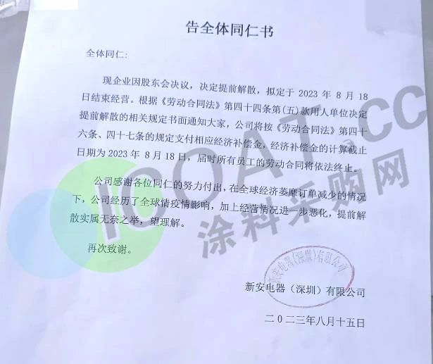 成立38年的深圳新安电器公司于2023年8月宣布解散,原因是因为全球经济萎靡,导致订单减少,加上此前疫情的影响,经营状况不断恶化,最终无力支撑。
