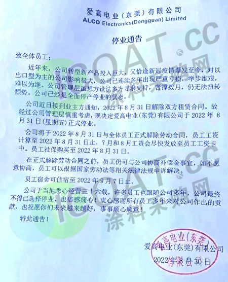 经营36载的东莞大厂爱高电业,于去年8月正式停业,其称连续多年出现严重亏损,举步艰难,苦撑数月,仍无法扭转颓势。