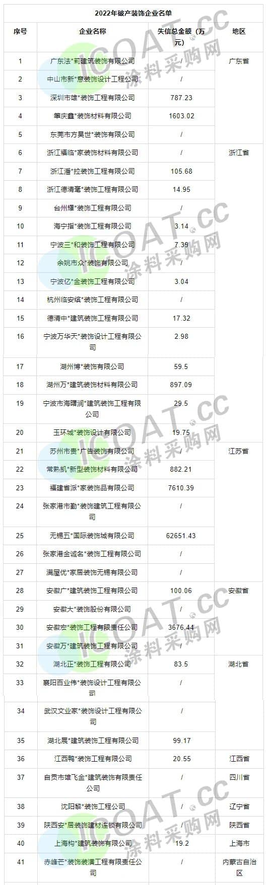 今年上半年发布破产文书的装饰企业达到46家,达到近3年来同期的新高。分省份看,浙江破产装企最多,达到10家,随后依次是湖南、江苏、广东、安徽、陕西等。