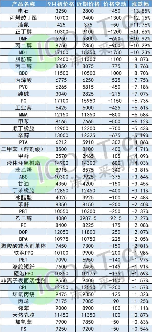 据涂料采购网了解,黄金周小长假归来后,50多种化工品价格持续下滑,目前较9月初报价有了较大的差距,吨价最高下滑1750元,跌幅近2成。