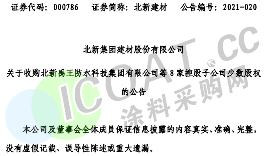 2021年3月31日,北新建材拟收购禹王系公司的剩余30%股权。本次收购完成后,公司将持有禹王系公司100%股权,禹王系公司将成为公司的全资子公司。而在2019年10月,北新建材分别收购了禹王防水、四川禹王、安徽禹王、湖北禹王、广东禹王、禹王工程、禹王橡胶、禹王化纤8家禹王系公司的70%股权,估算合计成交额近7.7亿元。