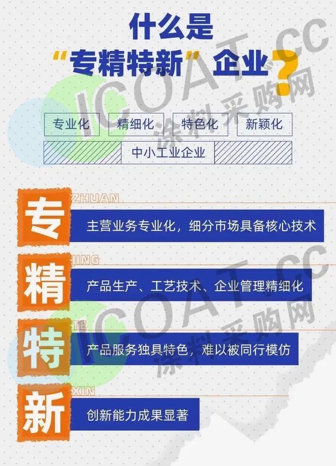 “专精特新”与2021年年初被中国财政部、工业和信息化部联合支持,2022年被首次写入政府工作报告。指的是“专业化、精细化、特色化、新颖化”。“专精特新”企业又分为创新型中小企业、专精特新中小企业、专精特新「小巨人」企业几类。