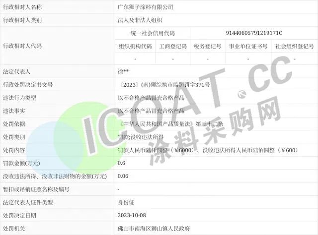 广东狮子涂料有限公司因销售不合格产品冒充合格产品,被没收违法所得600元并罚款0.6万元。