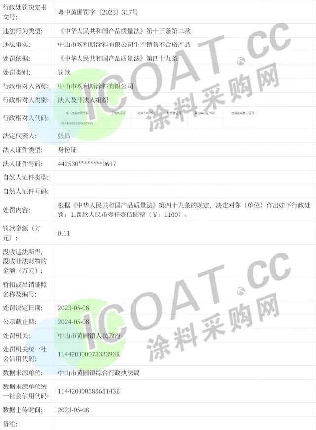 中山市埃利斯涂料有限公司因生产销售不合格产品,被罚款0.11万元。
