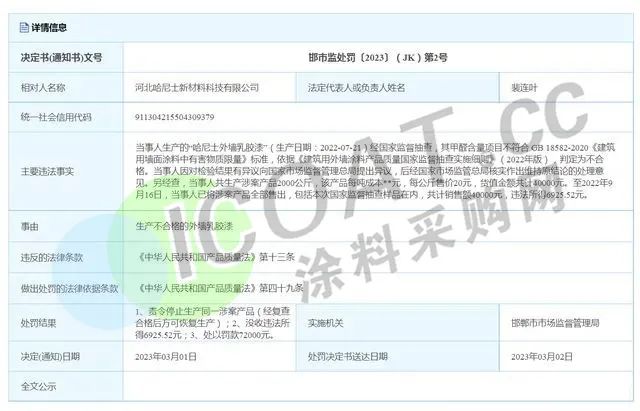 河北哈尼士新材料科技有限公司因生产不合格的外墙乳胶漆,被处以罚款7.2万元并没收违法所得。