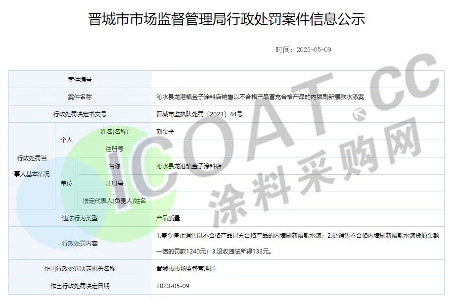 沁水县龙港镇金子涂料店因销售不合格产品冒充合格产品的内墙刷新爆款水漆,被罚款1240元,没收违法所得133元。