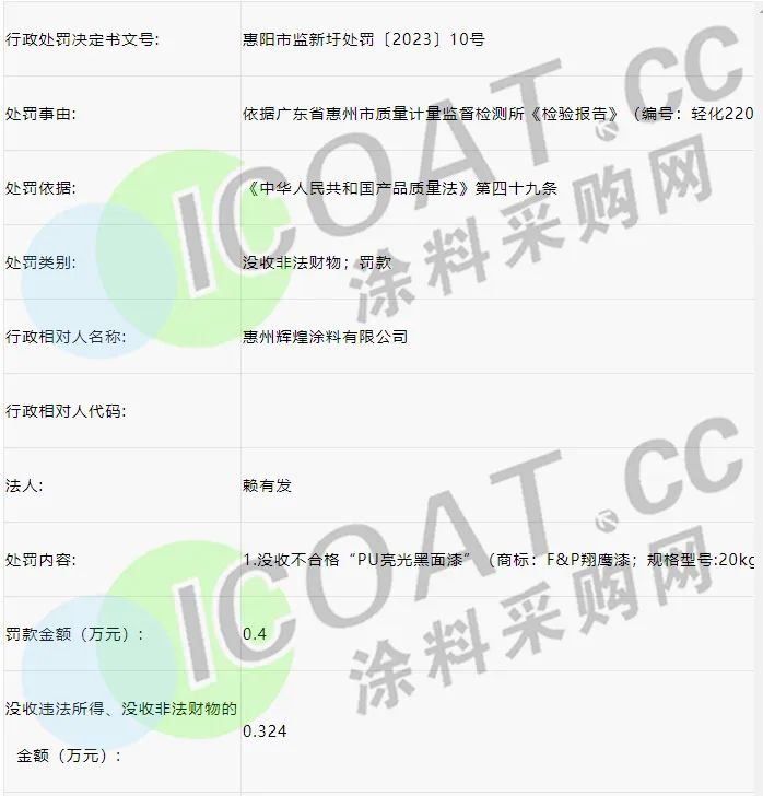 惠州辉煌涂料有限公司生产的“PU亮光黑面漆”“乙二醇醚及醚酯总和含量”项目不符合GB 18581-2020《木器涂料中有害物质限量》标准,判定为监督总体不合格。惠州市惠阳区市场监督管理局对其罚款人民币4000元,并没收不合格产品9桶(其中一桶已开封,已抽样损耗2kg)。