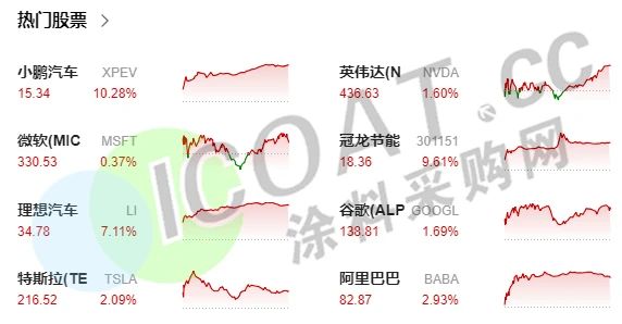 热门中概股全线上涨,阿里巴巴涨2.93%,京东涨1.81%,拼多多涨3.98%,蔚来汽车涨6.59%,小鹏汽车涨10.28%,理想汽车涨7.11%,哔哩哔哩涨7.36%,百度涨3.75%,新东方涨3.65%,网易涨5.09%,腾讯音乐涨5.15%,爱奇艺涨5.27%。