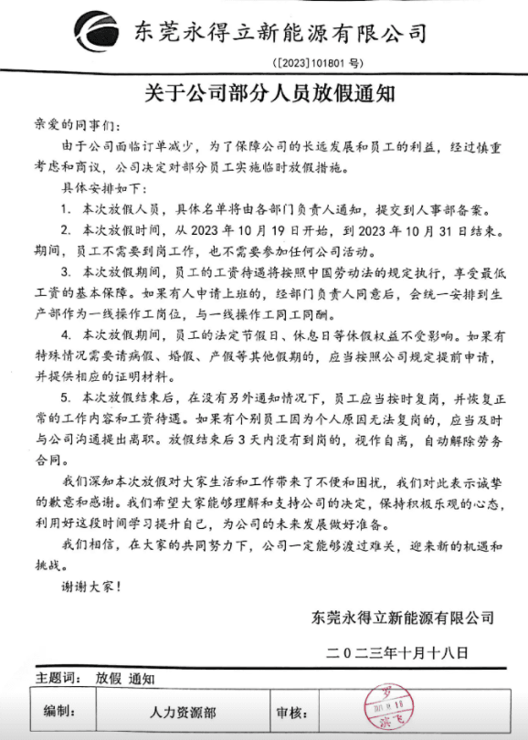 东莞某新能源企业发布放假通知,由于公司面临订单减少,经过慎重考虑和商议,决定对部分员工实施临时放假措施。放假时间从2023年10月19日开始,到2023年10月31日结束。放假期间,员工的工资待遇将按照中国劳动法的规定执行,享受最低工资的基本保障。