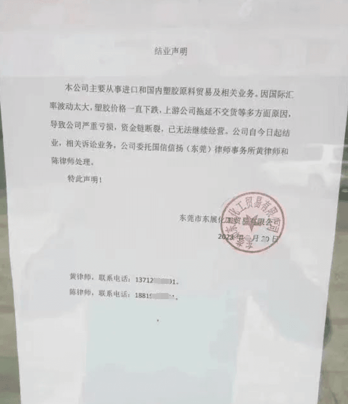 在东莞扎根27年的大型化工企业东展化工宣布全面停产,主要原因是,受宏观经济影响,全球塑胶化工市场形势严峻,导致国际汇率大幅波动,塑胶产品价格随之大幅下滑,这使得公司的日常经营陷入困境,无法继续维持。