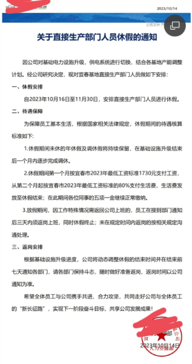 江西某新能源企业表示,要求宜春基地直接生产部门人员自2023年10月16日至11月30日进行休假,休假期间第一个月按宜春市2023年最低工资标准1730元支付工资,从第二个月起按宜春市2023年最低工资标准的80%支付生活费,生活费发放至休假结束。