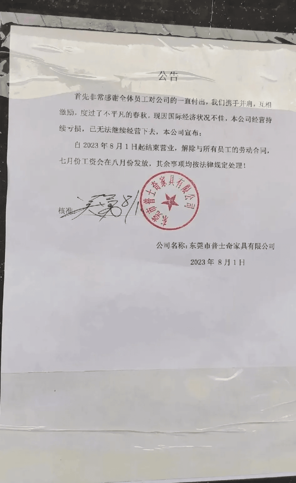 东莞市普士奇家具宣布结束营业,解除与所有员工的劳动合同。