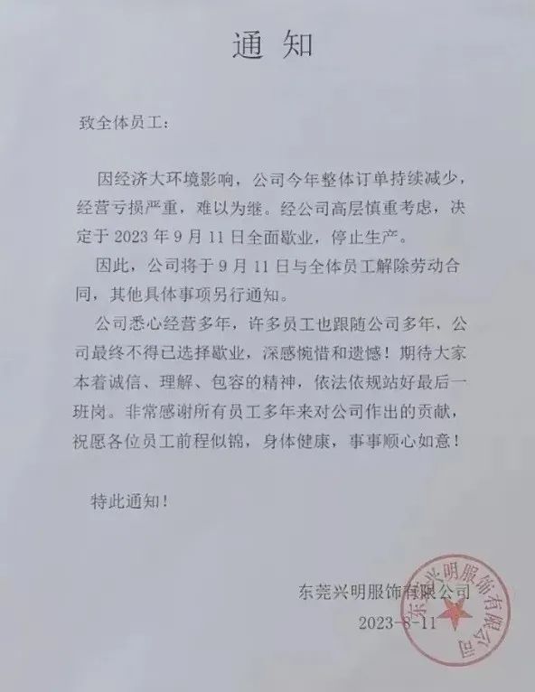 东莞兴明服饰表示,因经济大环境影响,今年整体订单持续减少,经营亏损严重,难以为继。经慎重考虑,决定全面歇业,停止生产。